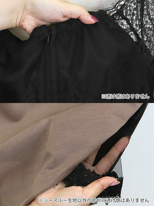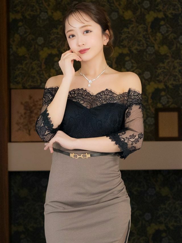 4. [アウトレット] タイト ミニドレス 袖あり オフショルダー 大きいサイズ フラワーレース 上品 七分袖 ウエストベルト付き (みりちゃむ着用) [Tika/ティカ]
