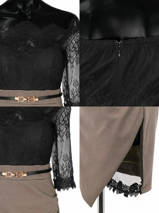 着るだけでスタイル美人になれる♪ [アウトレット] タイト ミニドレス 袖あり オフショルダー 大きいサイズ フラワーレース 上品 七分袖 ウエストベルト付き (みりちゃむ着用) [Tika/ティカ]