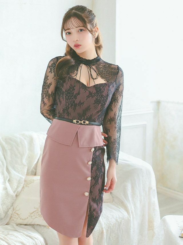 キャバドレス ミニ丈 キャバクラ クラブ ラウンジ ネックリボン フラワーレース バストカット ペプラム 袖あり 七分袖 谷間魅せ タイトミニドレス