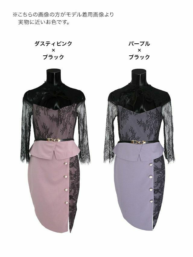 4. [アウトレット] ネックリボン フラワーレース バストカット ペプラム 袖あり 七分袖 谷間魅せ タイトミニドレス (Sサイズ~XXLサイズ) (黒嵜菜々子/キャバドレス着用) [Tika/ティカ]