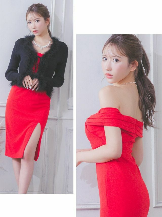 5. ツイストタックオフショルダーワンカラーサイドスリット膝丈タイトドレス (Sサイズ~XLサイズ) (/キャバドレス着用) [Tika/ティカ]