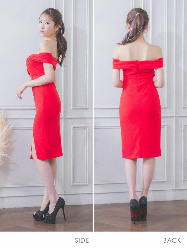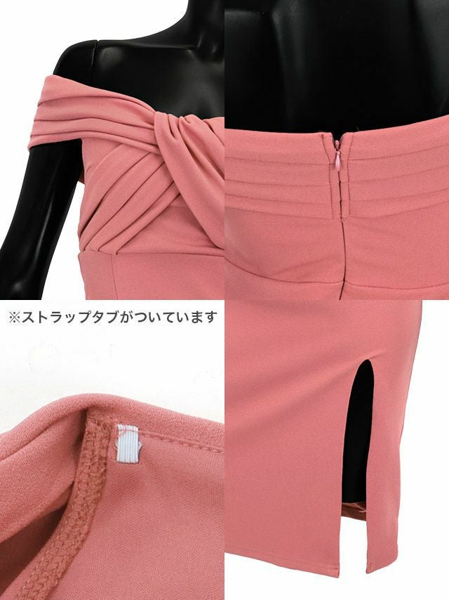4. ツイストタックオフショルダーワンカラーサイドスリット膝丈タイトドレス (Sサイズ~XLサイズ) (/キャバドレス着用) [Tika/ティカ]