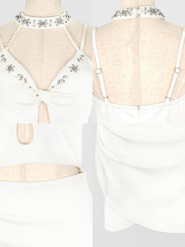 ホルターネックビジュー付きツイストキャミタイトミニドレス