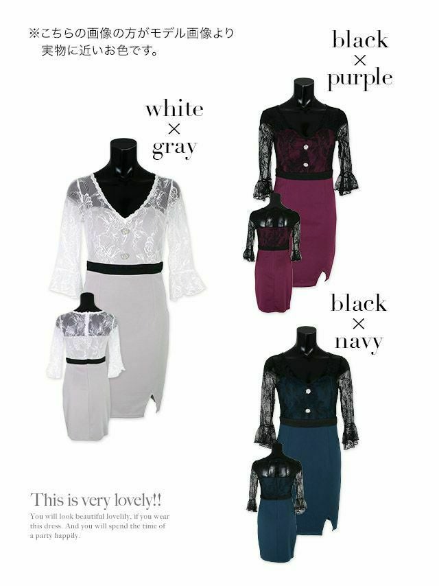 袖レースウエスト切替タイト袖ありミニドレス (Sサイズ~XXLサイズ) (聖菜/キャバドレス着用)