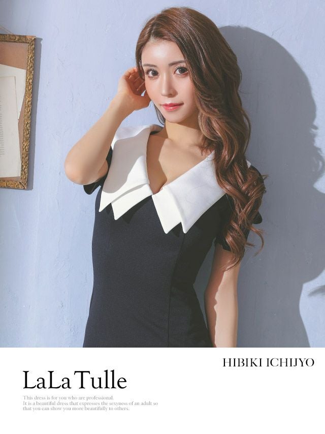 4. 韓国ドレス ビッグカラー襟デザイン半袖マーメイドパフスリーブガーリースタイル膝丈ドレス (Sサイズ~Lサイズ) (一条響/キャバドレス着用)