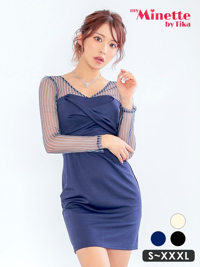 3. [SALE]胸元クロスデザイン 長袖 シースルー ストライプ タイト ミニドレス (Sサイズ〜XXXLサイズ)(ちぴたん/キャバドレス着用)[myMinette/マイミネット]