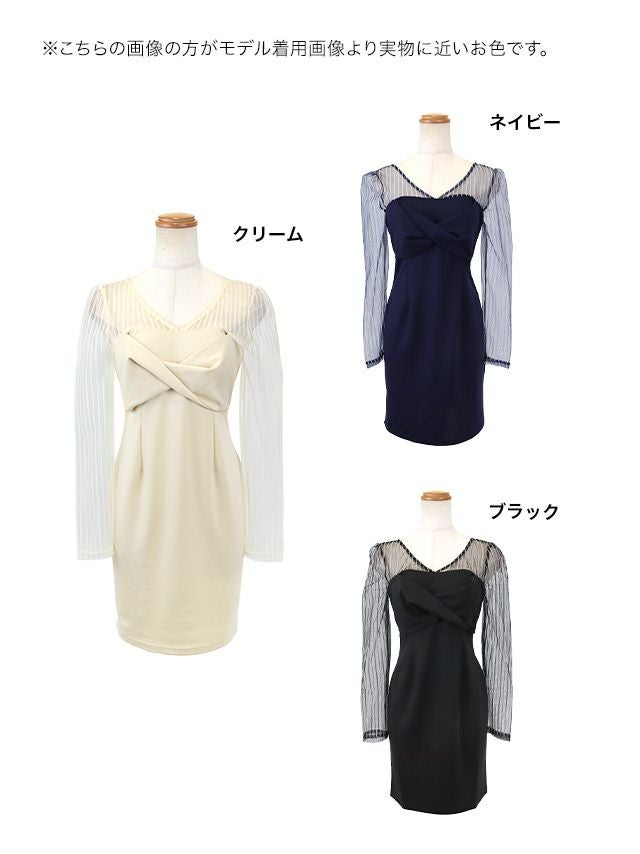 5. [SALE]胸元クロスデザイン 長袖 シースルー ストライプ タイト ミニドレス (Sサイズ〜XXXLサイズ)(ちぴたん/キャバドレス着用)[myMinette/マイミネット]