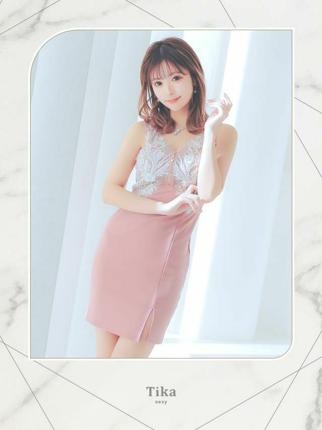 3. [アウトレット]Vネック ビジュー 刺繍 シアー切替 フロントジップ ノースリーブ 背中魅せ タイトミニドレス (Sサイズ~Lサイズ) (聖菜/キャバドレス着用)[Tika/ティカ]