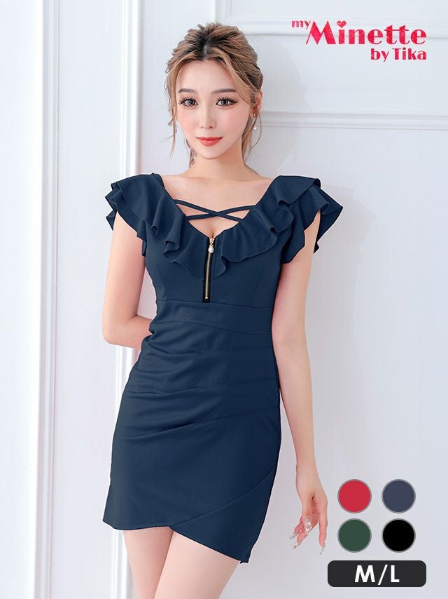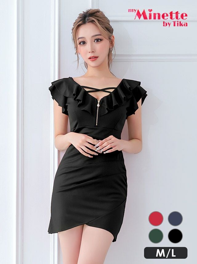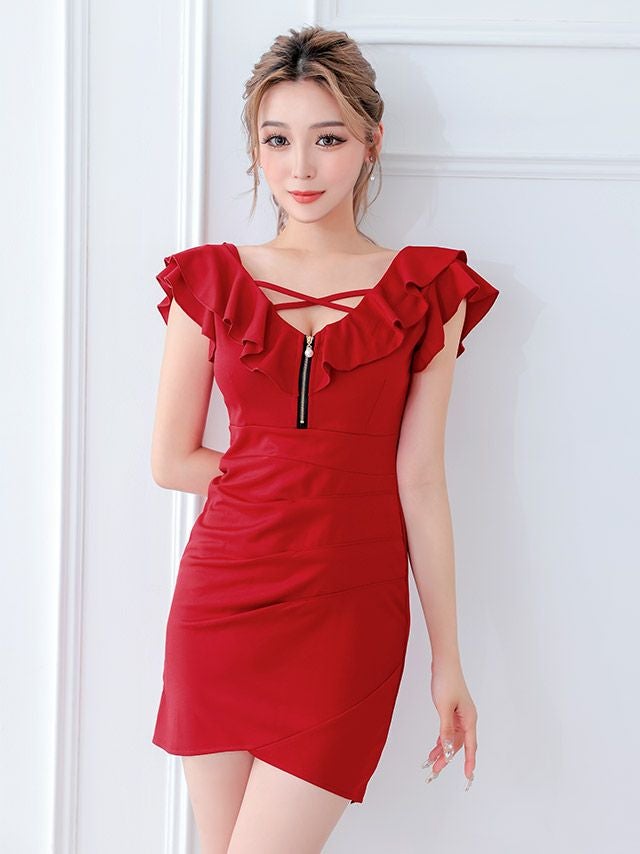 キャバドレス 安い 激安 ミニ丈 キャバクラ クラブ ラウンジ フロントZIP×クロスライン フリル袖 半袖 タイト ミニ ドレス プチプラドレス