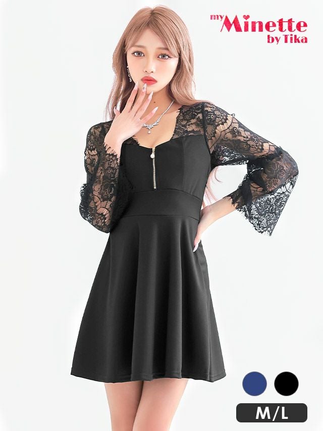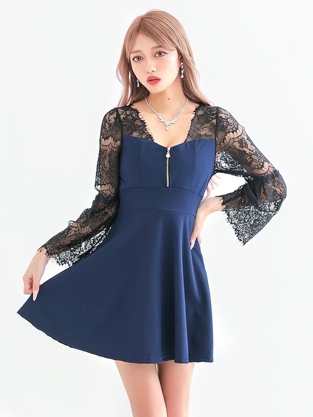 3. [SALE] ミニドレス プチプラ 新人 ジップ 長袖 ワンピース フレア セクシー レース 花柄 低身長 ネイビー キャバドレス (林姫奈妙着用/M~Lサイズ対応) | myMinette/マイミネット
