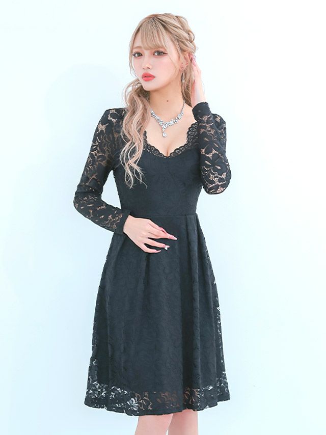 5. [SALE]刺繍レース長袖ハイウエスト切替フレアプチプラ膝丈ドレス (Sサイズ~XXXLサイズ)(林姫奈妙/キャバドレス着用)[myMinette/マイミネット]
