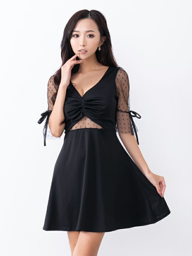 キャバドレス 安い 激安 ミニ丈 キャバクラ クラブ ラウンジ シースルー リボン ドット袖 ウエストカット フレア ミニドレス プチプラドレス