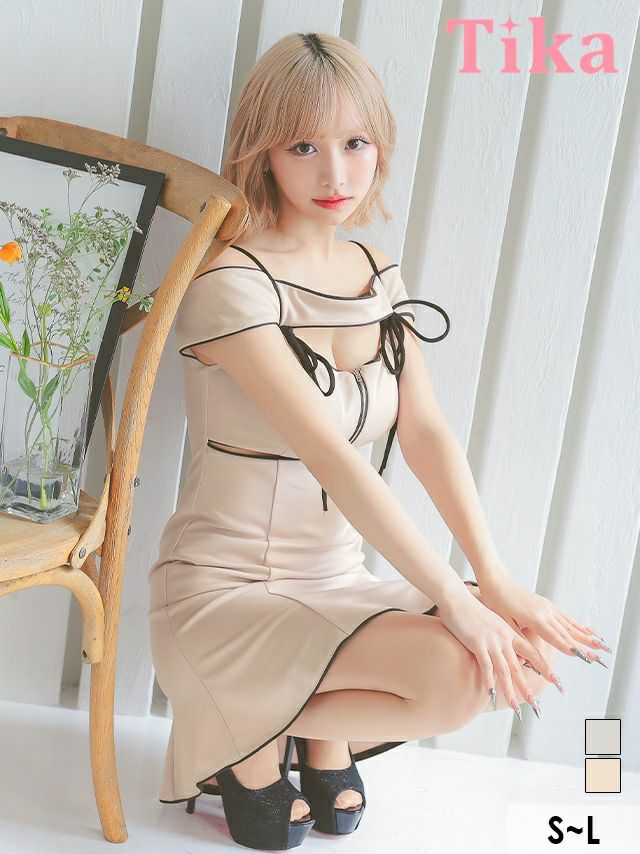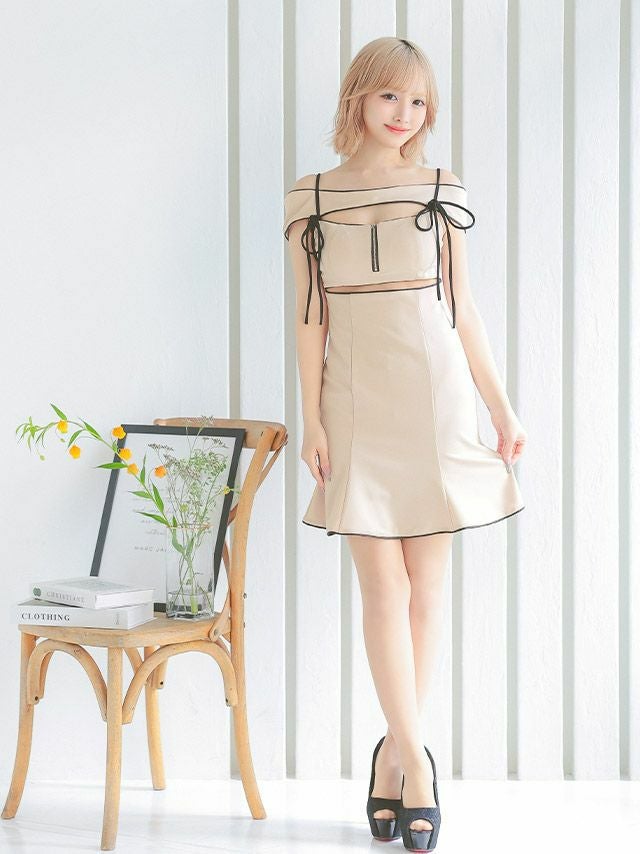 キャバドレス ミニ丈 キャバクラ クラブ ラウンジ Aライン ミニドレス 谷間 肩出し 二の腕カバー コードリボン ジップ ウエストカットアウト シンプル パイピングデザイン