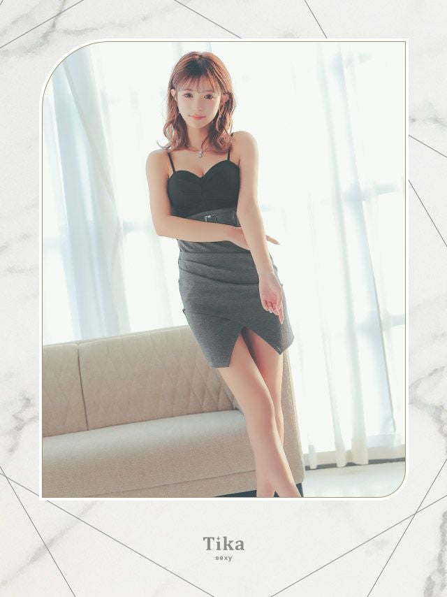 ラップスカートで美脚魅せ♪ [アウトレット]バイカラーキャミソールギャザーラップウエストベルトタイトミニドレス (Sサイズ~XLサイズ) (聖菜/キャバドレス着用)