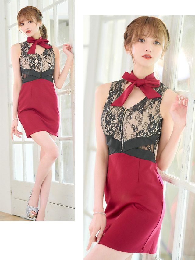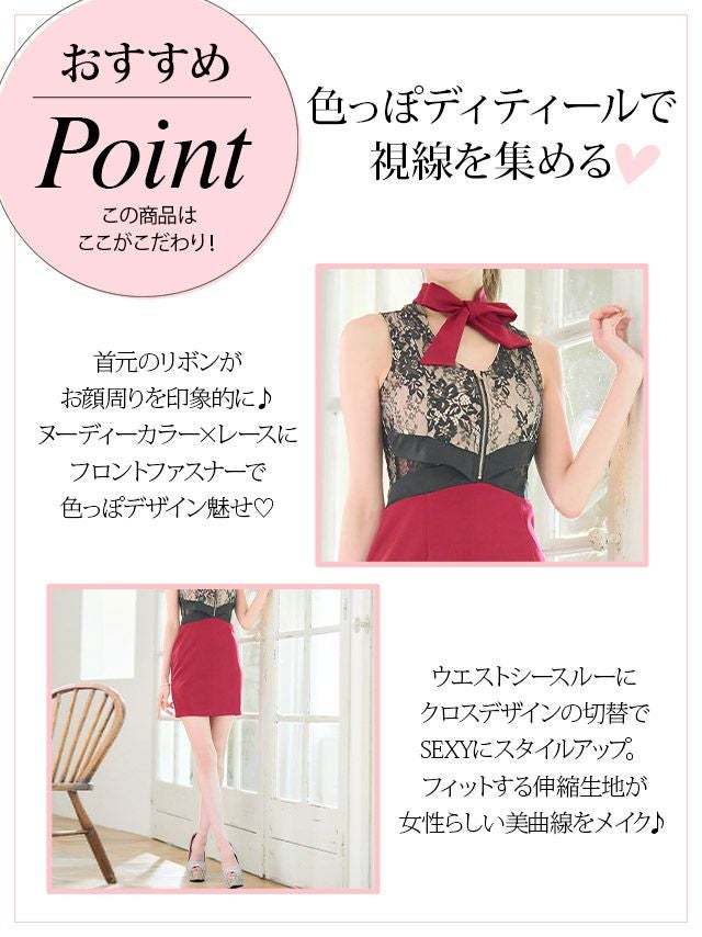 キャバドレス ミニ丈 キャバクラ クラブ ラウンジ ノースリーブ ヌーディー レース ネックリボン ジップ くびれ クロス 切替 タイトミニドレス