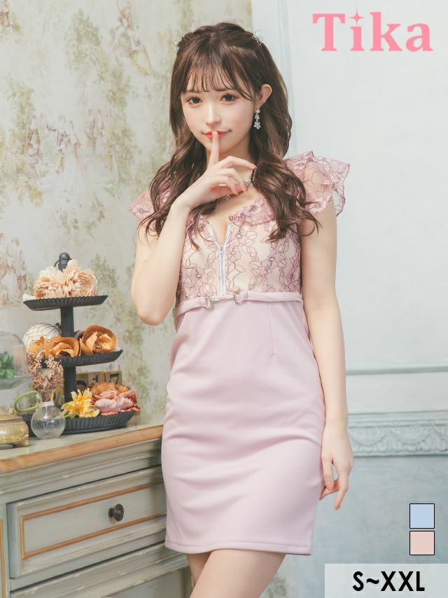 3. フリル袖 フラワーレース フロントジップ ウエストベルト 半袖 タイトミニドレス (Sサイズ~XXLサイズ) (上ノ堀結愛/キャバドレス着用) [Tika/ティカ]