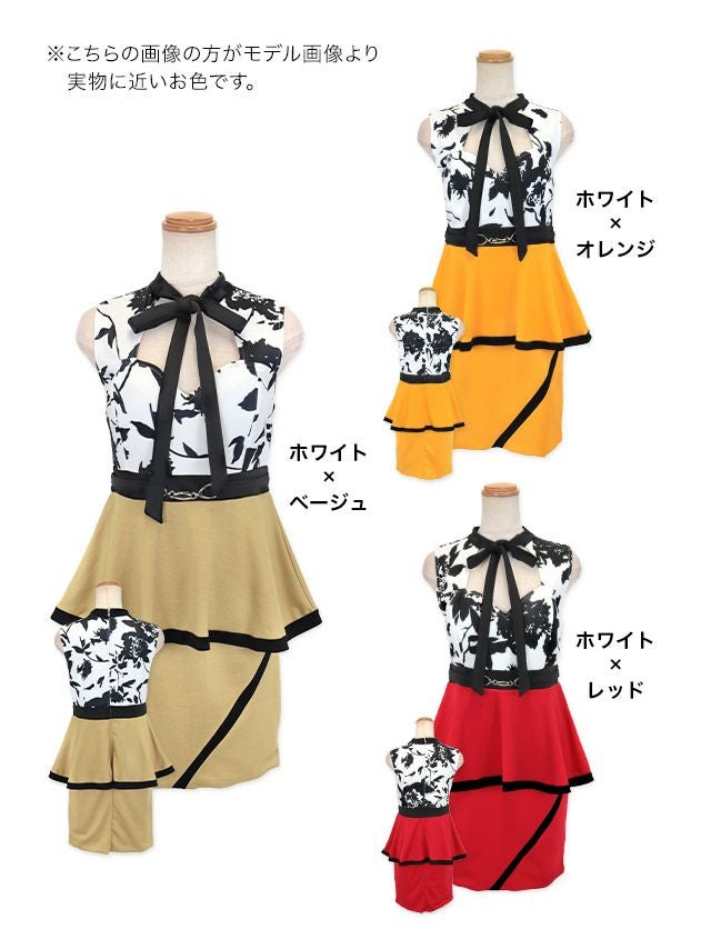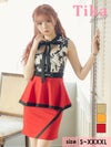 3. フラワープリントネックリボンハートカットウエスト切替パイピングペプラムノースリーブタイトミニドレス (Sサイズ~XXXXLサイズ) (戦慄かなの/キャバドレス着用) [Tika/ティカ]