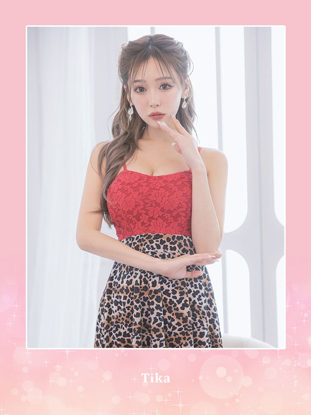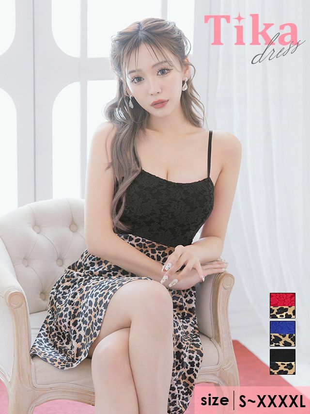 キャミソールフラワーレースベロアレオパード切替フレアミニドレス (Sサイズ~XXXXLサイズ) (せいせい/キャバドレス着用) [Tika/ティカ]