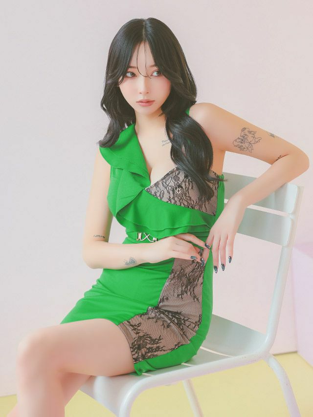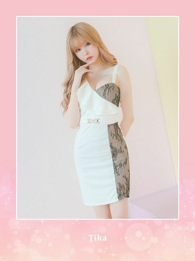 3. [アウトレット]サイドヌーディーカラー×ブラックレース切り替えアシメワンショルダー風フリル袖ウエストベルト付きタイトミニドレス (Sサイズ~XXXXLサイズ) (PyunA./キャバドレス着用) [Tika/ティカ]