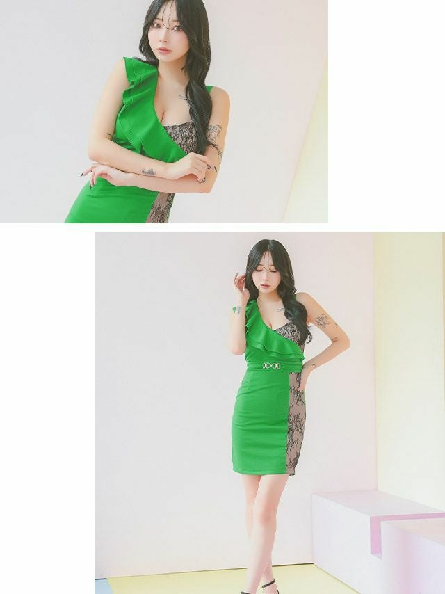 5. [アウトレット]サイドヌーディーカラー×ブラックレース切り替えアシメワンショルダー風フリル袖ウエストベルト付きタイトミニドレス (Sサイズ~XXXXLサイズ) (PyunA./キャバドレス着用) [Tika/ティカ]
