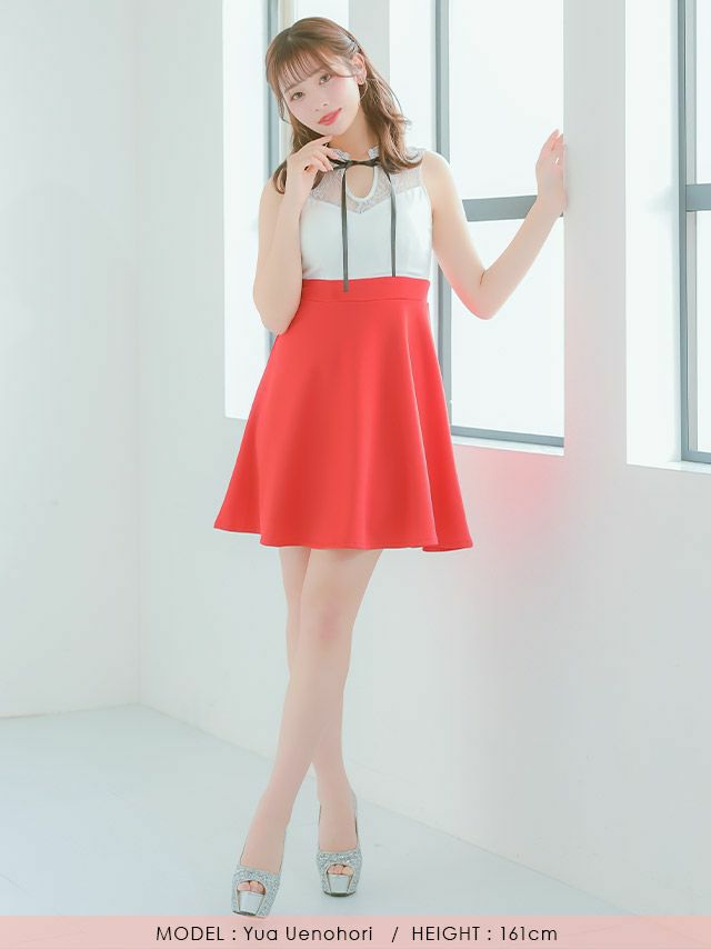 [アウトレット]ハイネック フラワーレース ネックリボン ノースリーブ バイカラー 切り替え フレアミニドレス (Sサイズ~ XXXXLサイズ) (重川茉弥/キャバドレス着用)[Tika/ティカ]