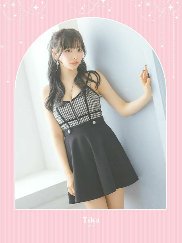 5. ツイードギンガムチェック柄バストジップキャミソールフレアミニドレス (Sサイズ~XLサイズ) (重川茉弥/キャバドレス着用) [Tika/ティカ]