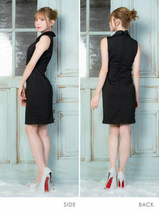 タイトミニドレス谷間シンプルノースリーブ襟付きバストカットジップストレッチブラジャーのままのサイドバック