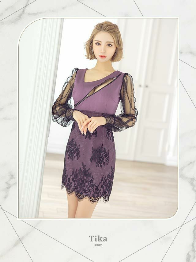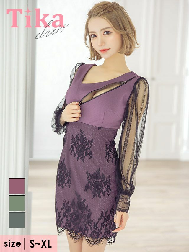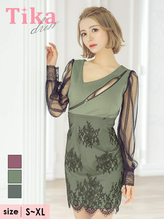3. シアー長袖 袖ありバストジッパーウエスト切替フラワーレースタイトミニドレス (Sサイズ~XLサイズ) (一条響/キャバドレス着用) [Tika/ティカ]