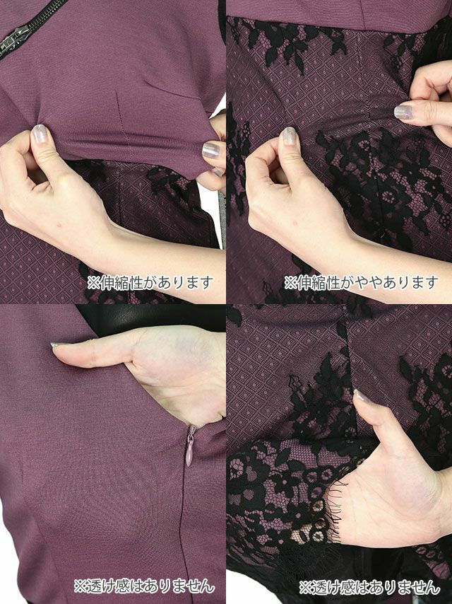 バックスリットあり フラワーレース フリル袖 バストジップ バック入り ストレッチ タイトロングドレスの品質画像