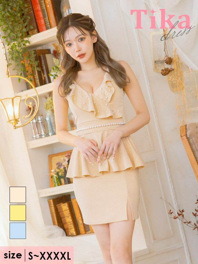 可愛い&華やかに演出♪ [アウトレット]ノースリーブVネックホワイトパール胸元フリルペプラムタイトミニドレス (Sサイズ~XXXXLサイズ) (せいせい/キャバドレス着用) [Tika/ティカ]