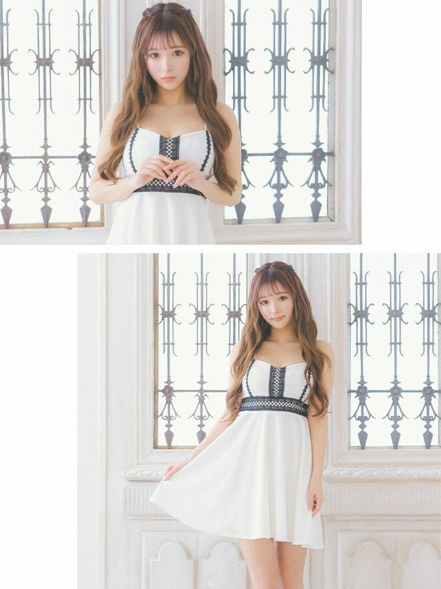 女の子らしい美シルエットをメイク♪ キャミソールブラック刺繍レース切替フレアミニドレス (Sサイズ~XXXXLサイズ) (浦西ひかる/キャバドレス着用) [Tika/ティカ]