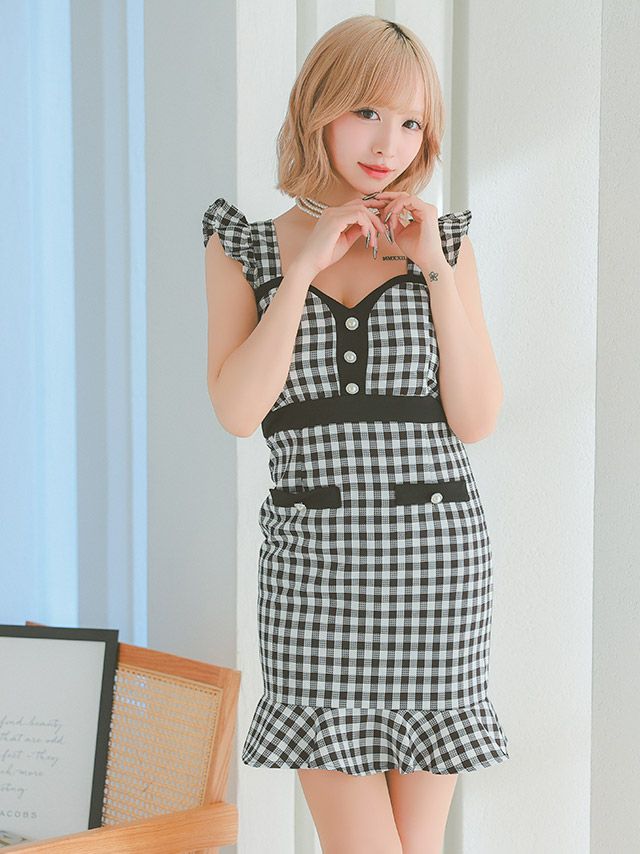 キャバドレス ミニ丈 キャバクラ クラブ ラウンジ ギンガムチェック柄 ハートカット ノースリーブ パイピング ボタン 裾フリル タイトミニドレス