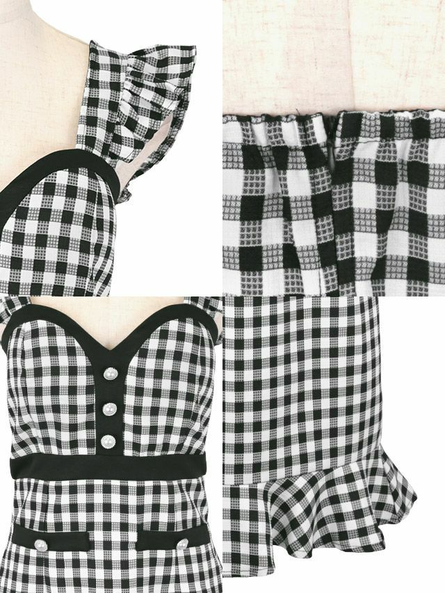 ギンガムチェック柄ハートカットノースリーブパイピングボタン裾フリルタイトミニドレスの商品画像4枚目