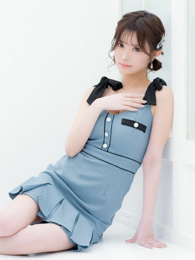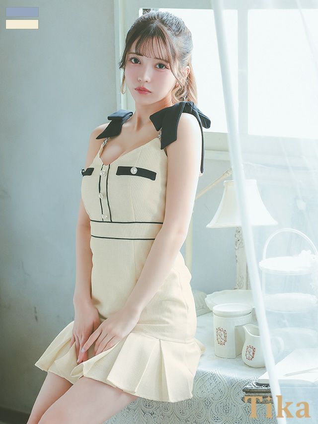 5. キャミソール リボン パイピング パールボタン ボックスプリーツ フレアミニドレス (Sサイズ~XLサイズ) (聖菜/キャバドレス着用) [Tika/ティカ]