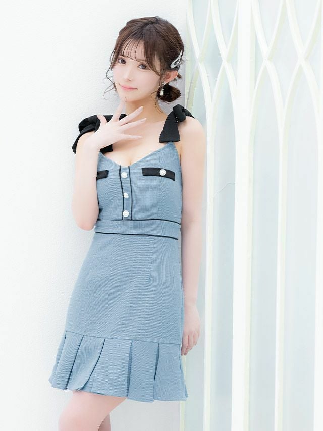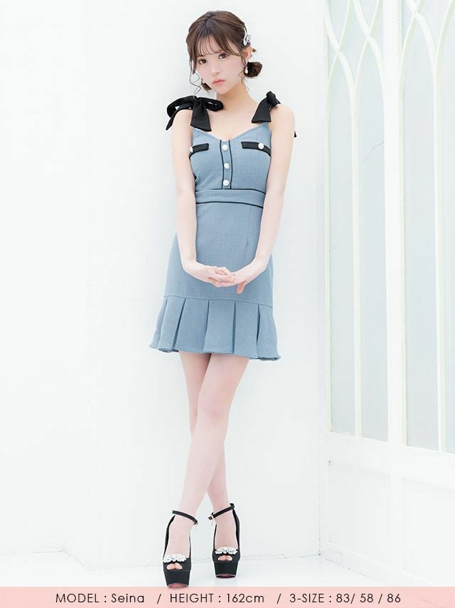 キャバドレス ミニ丈 キャバクラ クラブ ラウンジ キャミソール リボン パイピング パールボタン ボックスプリーツ フレアミニドレス