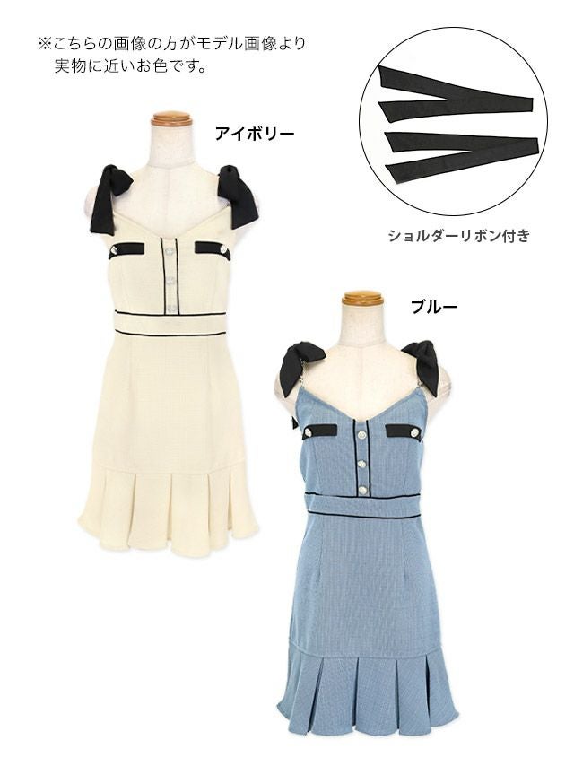 キャミソール リボン パイピング パールボタン ボックスプリーツ フレアミニドレスの商品画像1枚目