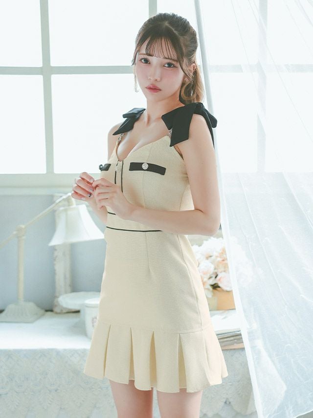 5. チェーン キャミソール リボン パイピング パールボタン ボックス裾プリーツ フレアミニドレス (Sサイズ~XLサイズ) (黒嵜菜々子/キャバドレス着用)