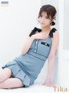 4. チェーン キャミソール リボン パイピング パールボタン ボックス裾プリーツ フレアミニドレス (Sサイズ~XLサイズ) (黒嵜菜々子/キャバドレス着用)