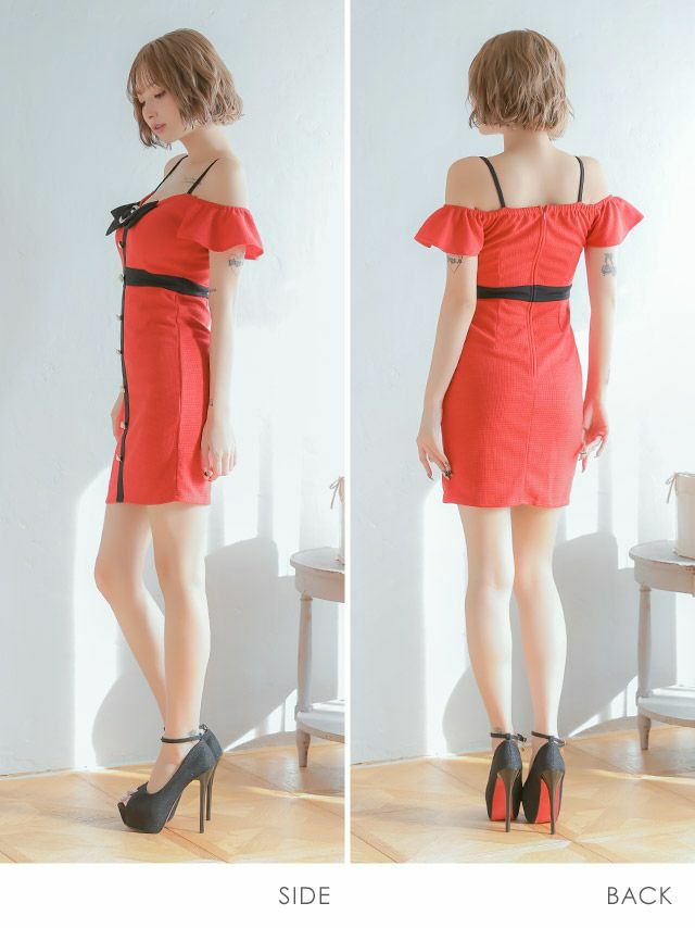 5. [アウトレット] 肩あきパイピングフロントボタンタイトミニドレス (Sサイズ~XLサイズ) (聖菜 PyunA./キャバドレス着用)