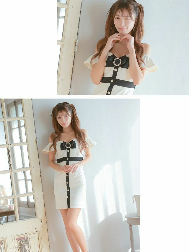 5. [アウトレット] リボンビジュー付き肩あきパイピングフロントボタンストレッチタイトミニドレス (Sサイズ~XLサイズ) (聖菜/キャバドレス着用)