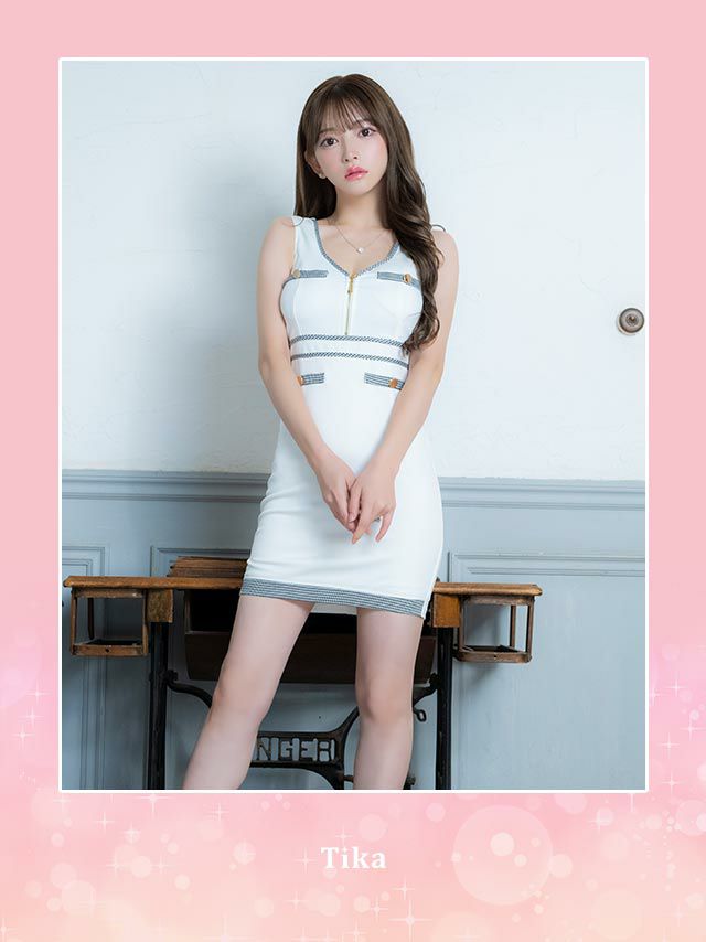 お洒落にメリハリボディにメイク♪ [アウトレット] ノースリーブバストジップパイピングチェック柄ボタンデザインタイトミニドレス (Sサイズ~XLサイズ) (黒崎みさ/キャバドレス着用)