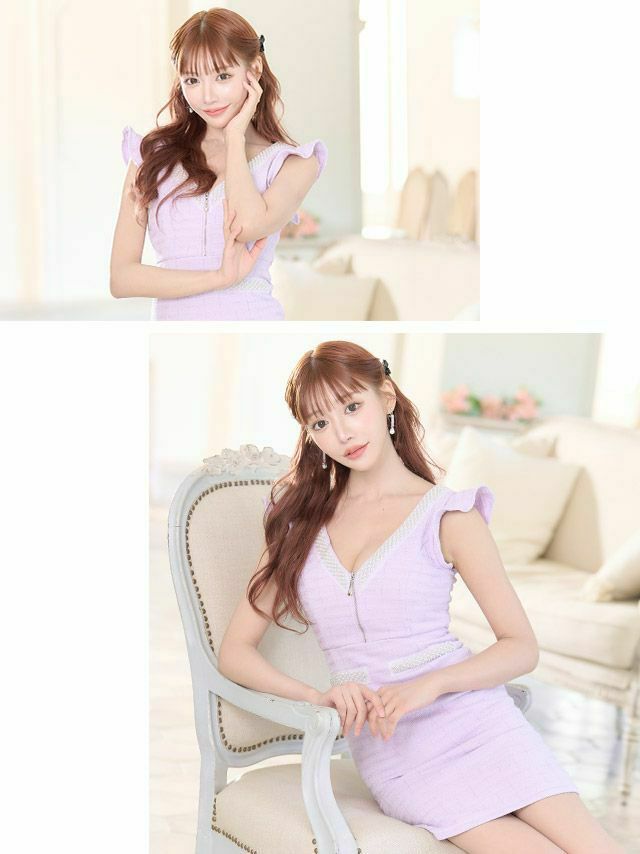 3. [アウトレット]ノースリーブ フリル袖 パール ビジュー付き Vネック ジップ ラメ入り ツイード タイトミニドレス (Sサイズ~XLサイズ) (浦西ひかる/キャバドレス着用)[Tika/ティカ]