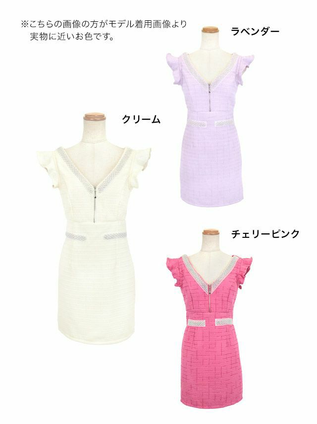 キャバドレス ミニ丈 キャバクラ クラブ ラウンジ ノースリーブ フリル袖 パール ビジュー付き Vネック ジップ ラメ入り ツイード タイトミニドレス