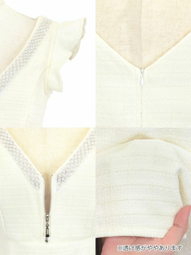 ノースリーブフリル袖Vネックパールビジューバストジップツイードタイトミニドレス