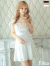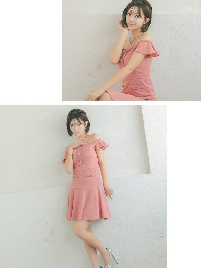 5. [アウトレット] 刺繍縁取りビジューボタンオフショルダーフリル袖ワンカラーフレアミニドレス (Sサイズ~XXLサイズ) (聖菜/キャバドレス着用)