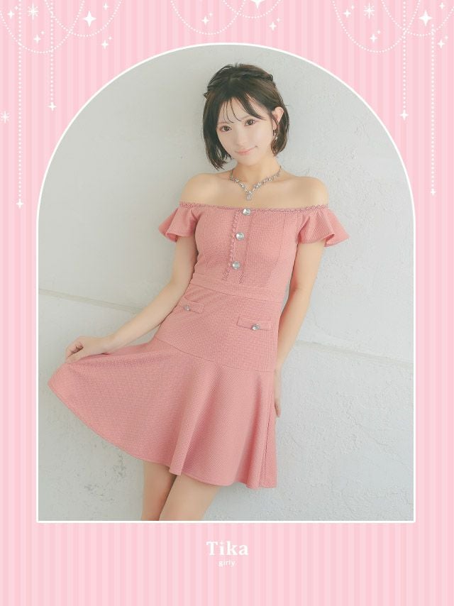 女の子らしいcuteデザイン♪ [アウトレット] 刺繍縁取りビジューボタンオフショルダーフリル袖ワンカラーフレアミニドレス (Sサイズ~XXLサイズ) (聖菜/キャバドレス着用)