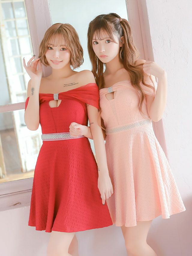 3. [アウトレット] シアーリボンオフショルダーバストカットアウトウエストビジューラインフレアミニドレス (Sサイズ~XLサイズ) (聖菜 PyunA./キャバドレス着用) [Tika/ティカ]