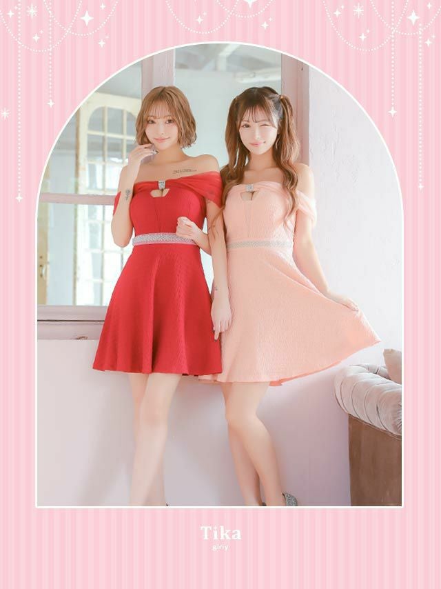 華やかな可愛さたっぷり♪ [アウトレット] チュールリボンオフショルダーバストカットウエストビジューラインワッフルフレアミニドレス (Sサイズ~XLサイズ) (PyunA./キャバドレス着用) [Tika/ティカ]