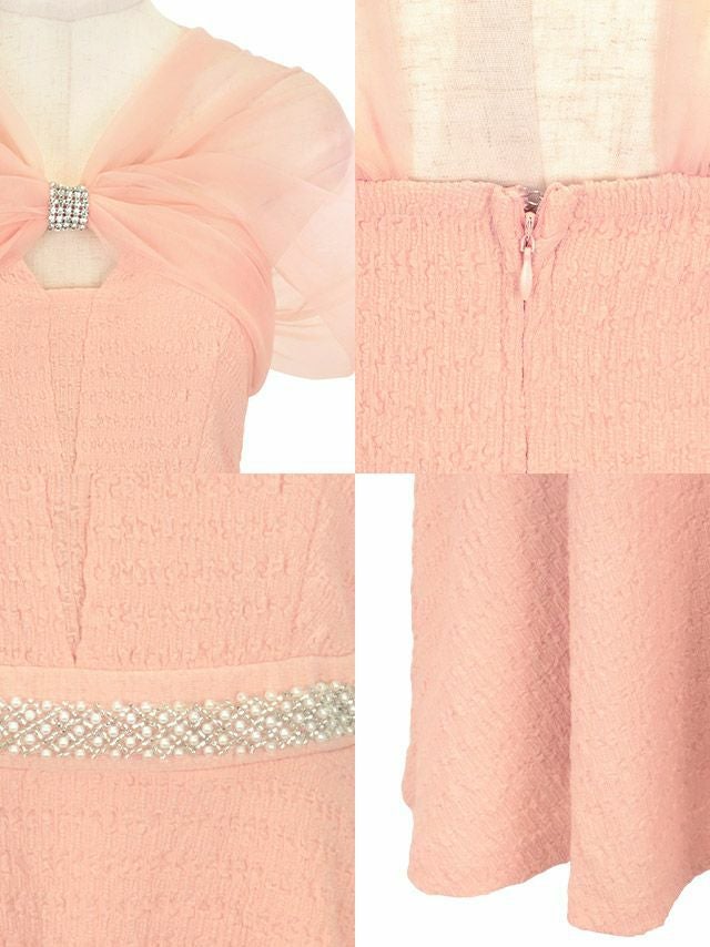 チュールリボンオフショルダーバストカットウエストビジューラインワッフルフレアミニドレスの商品画像4枚目
