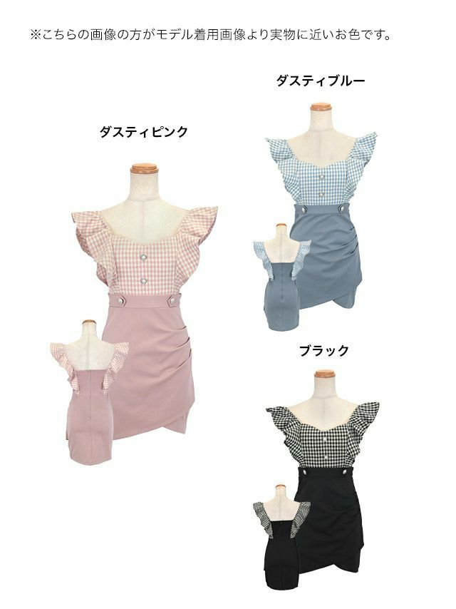 3. キャミソール フリル袖 フロントボタン ギンガムチェック柄 切り替え ラップ ギャザー タイトミニドレス (Sサイズ~XLサイズ) (重川茉弥/キャバドレス着用)[Tika/ティカ]